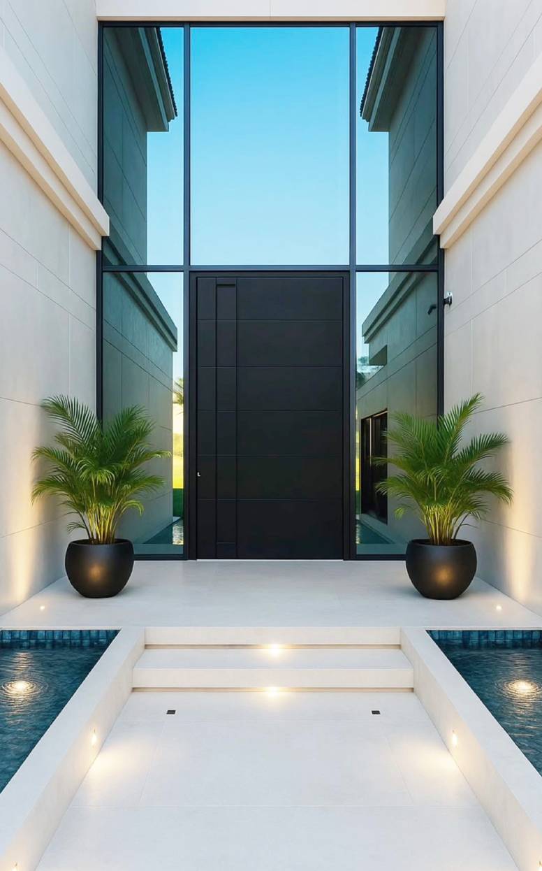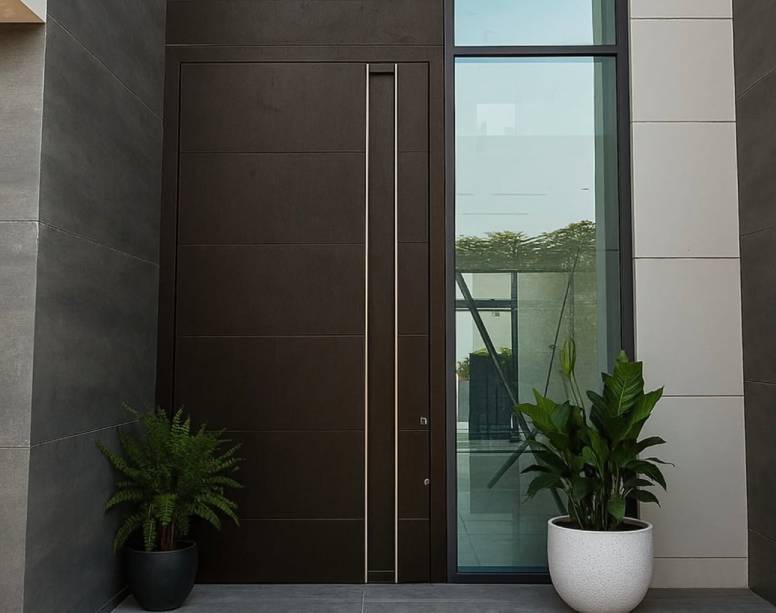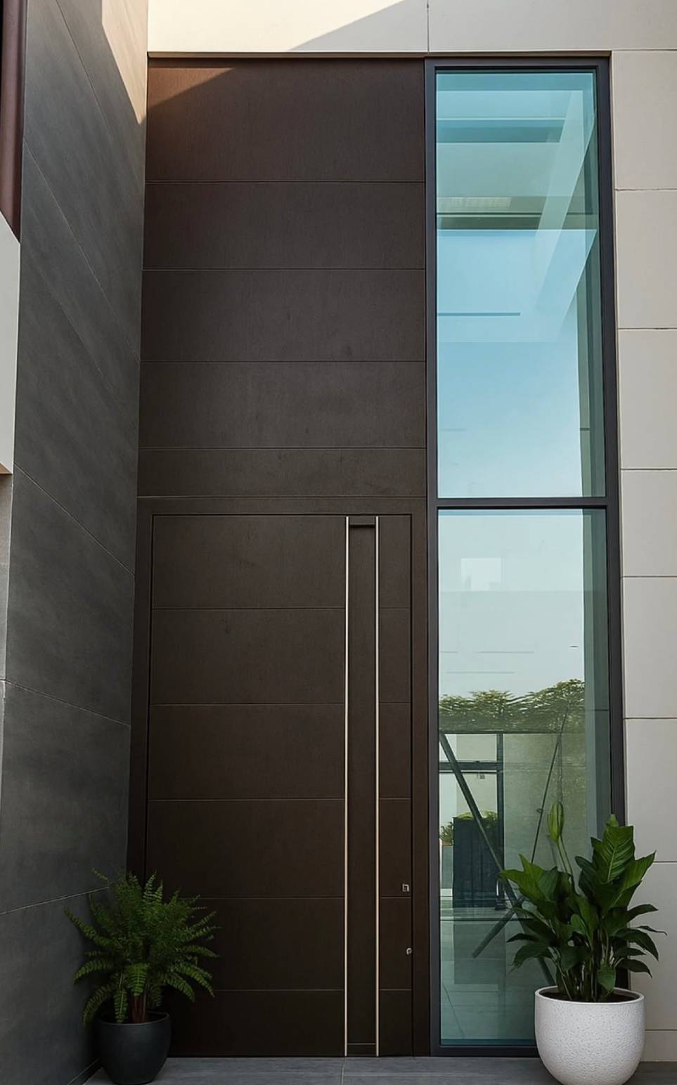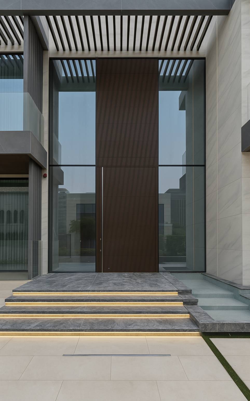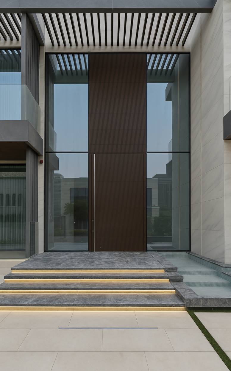 Questa splendida porta a bilico, realizzata in alluminio robusto e arricchita da una lussuosa finitura PVD Golden Honey, è elegantemente completata da un vetro temperato lucido Night Sky e da un maniglione Angle Altum. Il lettore di impronte digitali SecuroSmart, abbinato alla serratura Armo Comfort Electro, garantisce una sicurezza eccezionale.