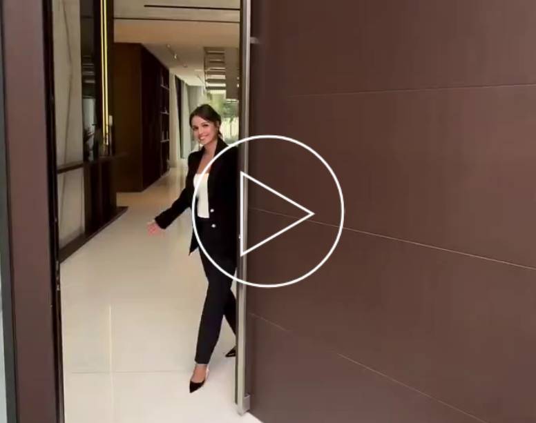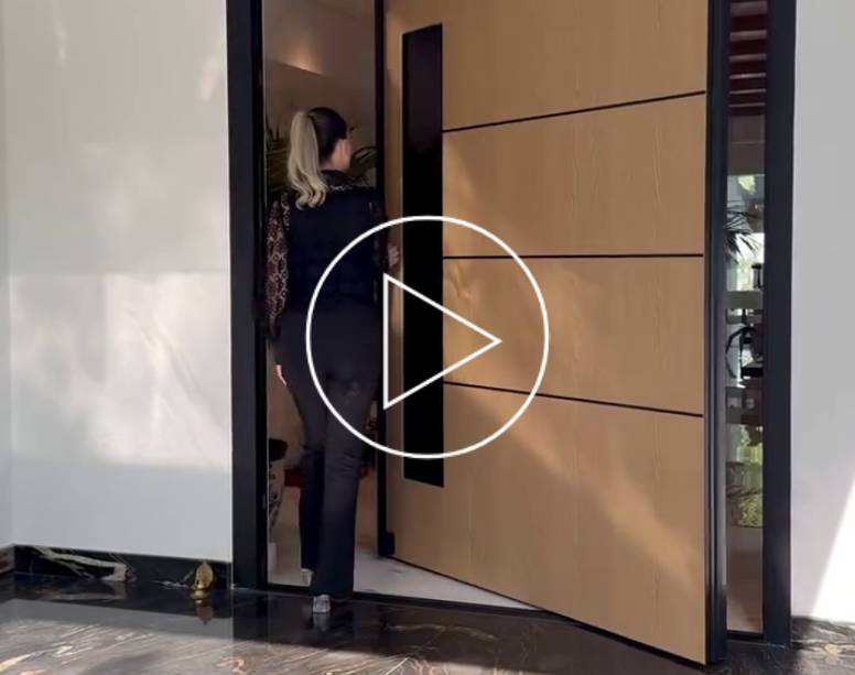 Questa sofisticata porta a bilico è realizzata in robusto alluminio ed è ulteriormente impreziosita da una finitura PVD Golden Honey. È dotata di un maniglione incassato con illuminazione SmartLux e di un lettore di impronte digitali SecuroSmart, abbinato alla serratura Armo Comfort Electro per una maggiore sicurezza.
